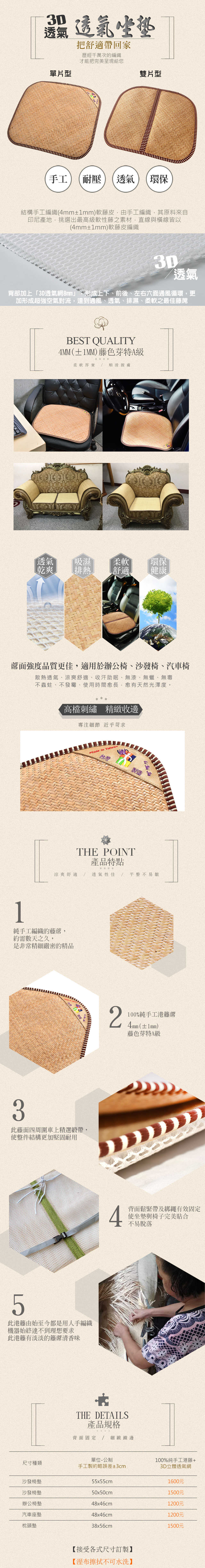 天然手工港籐蓆坐墊+3D立體加強透氣款